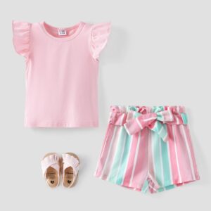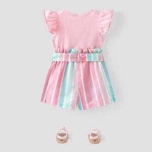 Dale un toque adorable a tu pequeña con este encantador conjunto de dos piezas. Incluye un top de manga corta con mangas volantes y unos shorts con cinturón decorativo de rayas, todo en un tono rosado delicado que resalta su dulzura natural.